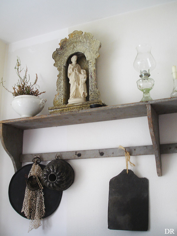 Ik heb een mooi Frans krukje meegenomen, een flessenrek (waar ik nog mooie flessen voor moet zoeken), een mooie grote grijze platte schaal en wat kleine decoratieflesjes.