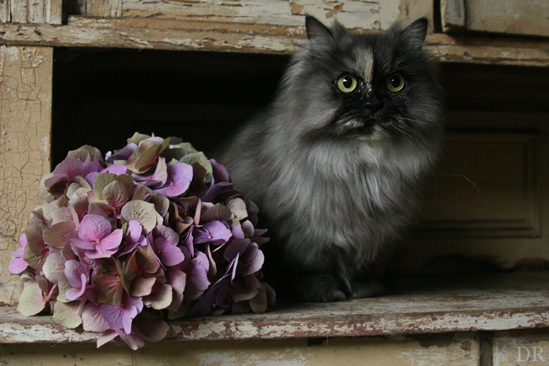 Met moeite heb ik besloten de hortensia bloem met prachtige kleuren af te knippen en te laten drogen. De kleuren zijn prachtig en verweerd. Moira kwam ook even kijken en maakte er een mooi compleet plaatje van.